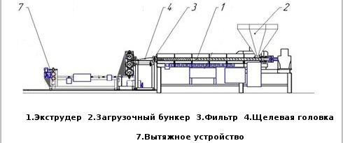 Экструзионное оборудование (экструдеры) состоит в основном из трех блоков - загрузочной зоны, шнековой пары (гильза + шнек) и экструзионной головки. После экструзионной головки обычно идет устройство охлаждения - (это может быть обдув воздухом или водой) и приемное устройство ( блок намоки для плоскощелевых и выдувных экструдеров).